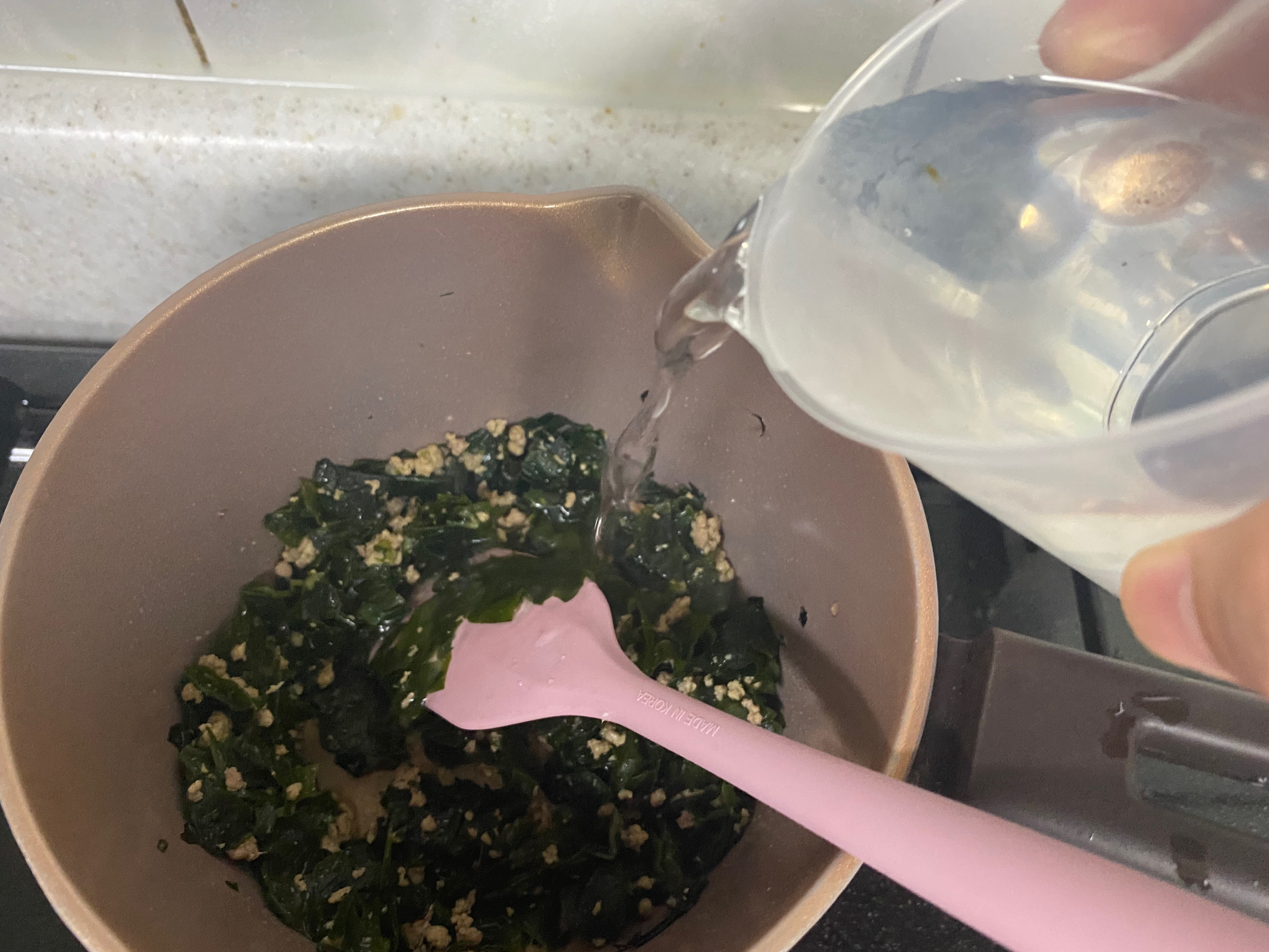 4. 어느정도 미역의 색이 변했다면 물 500ml정도(종이컵 3컵) 넣어주신 후 끓여줍니다.