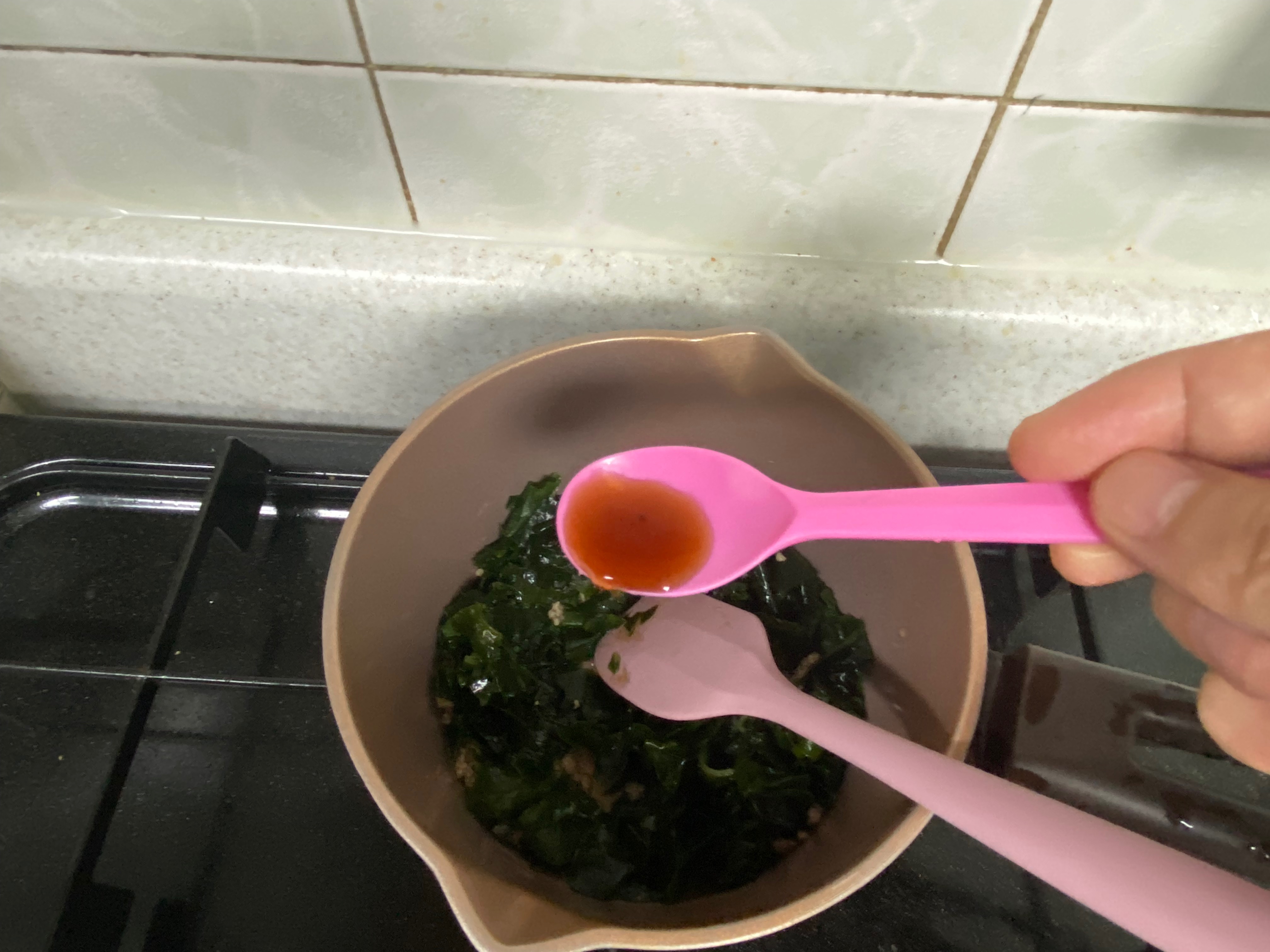 3. 아기 간장을 한스푼 넣어주시고, 미역은 색이 변할 정도로 볶아 주시면 됩니다.