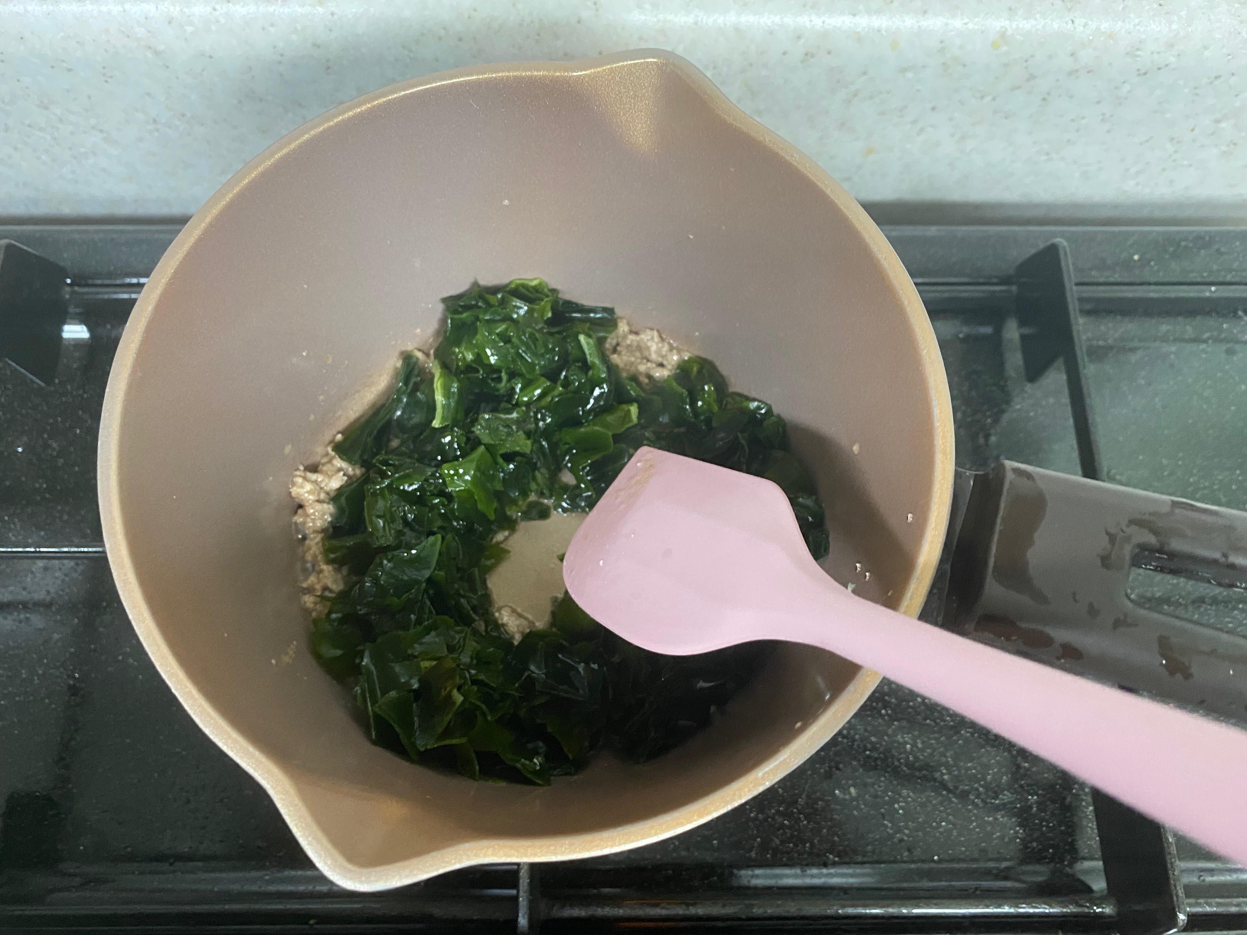 4. 어느정도 미역의 색이 변했다면 물 500ml정도(종이컵 3컵) 넣어주신 후 끓여줍니다.