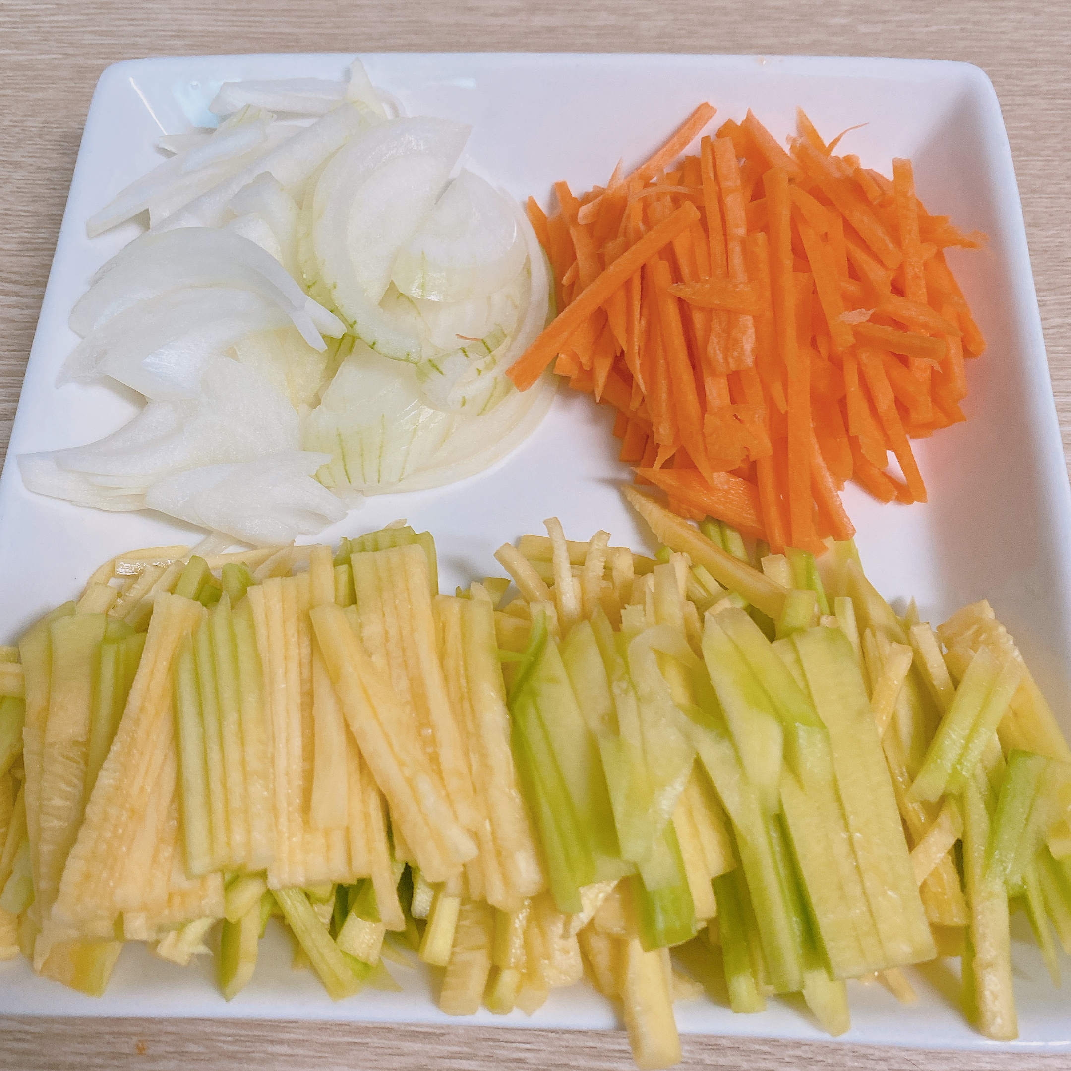 - 소면 준비, 양파 1/2개, 당근 1/4개, 애호박 1/2개