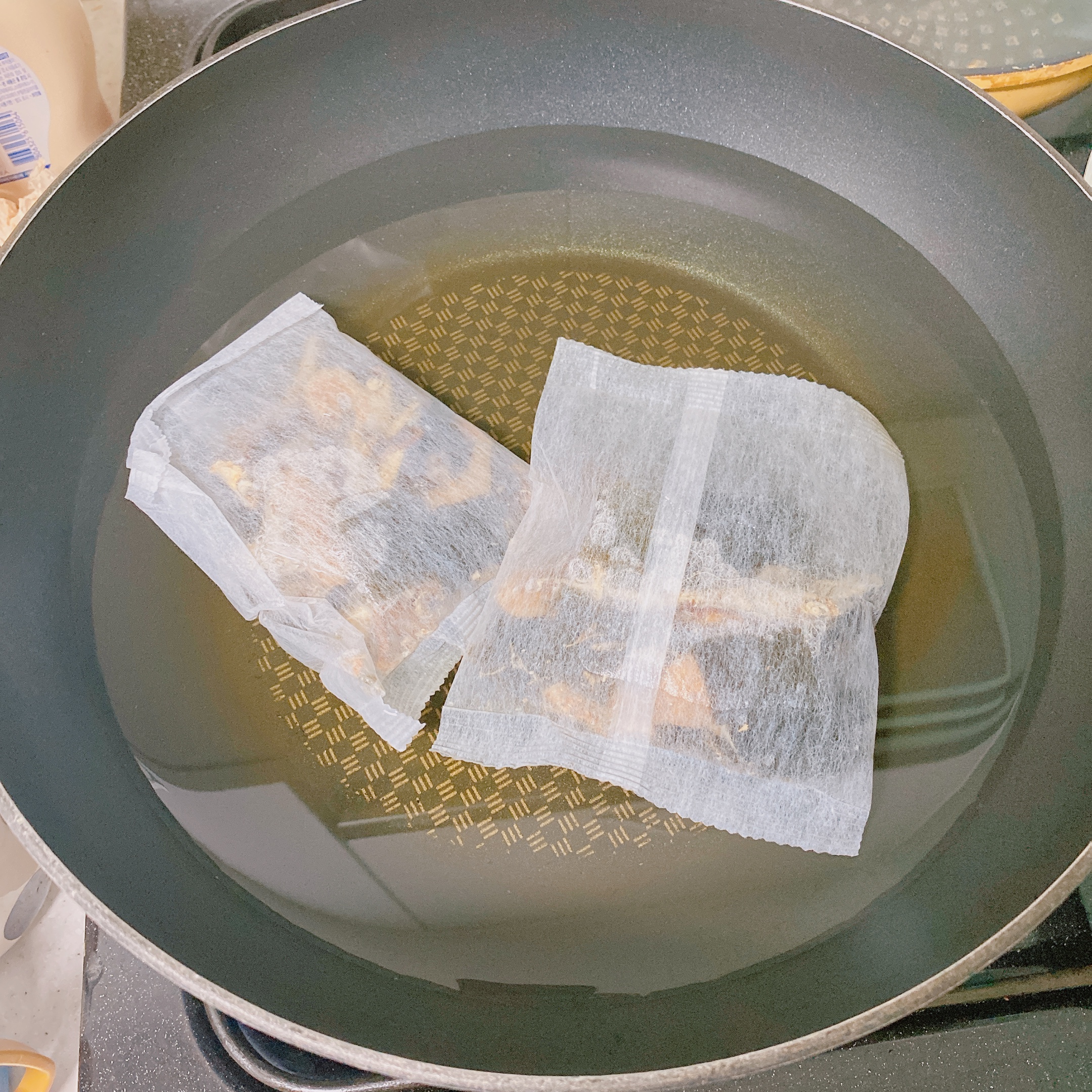 먼저 재료 준비 전 잔치국수 국물을 만들기 위해 해물팩을 미리 준비해 두었습니다. 2팩에 1.2L 준비했구요. 찬물에 미리 우려두고 15분 정도 끓여서 국물을 만들었어요 ㅎㅎ