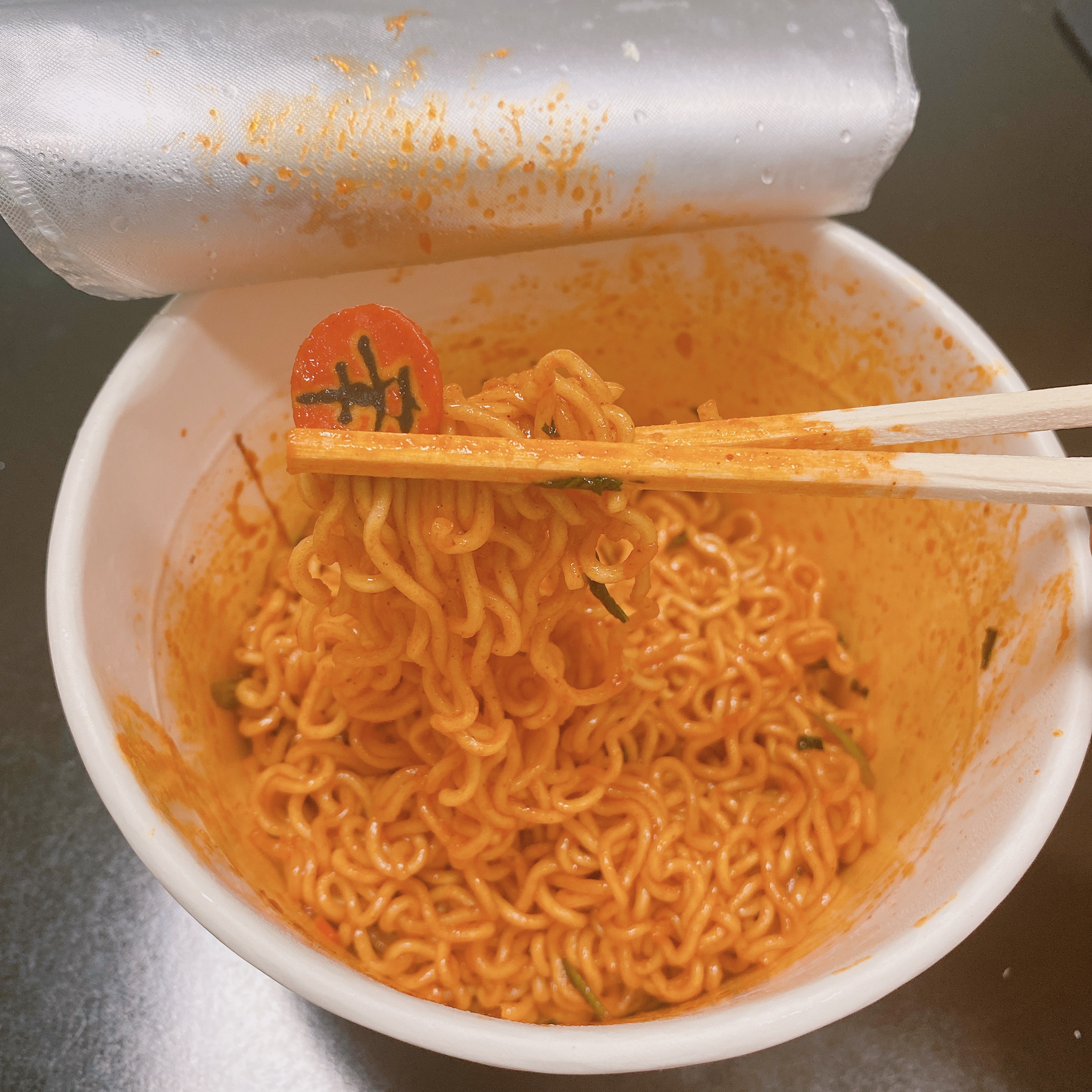 일단 비주얼은 괜찮았지만 약간 뻑뻑한 느낌이 들었고요. 맛은 처음에는 그냥 신라면 스프로 비벼 먹는거랑 머가 틀릴까라는 생각이 들었습니다. 약간 라면스프 맛이 너무 강하다고 생각이 들었거든요. 근데 워낙 라면을 좀 좋아하다보니 라면 좋아하는 사람들은 라면스프도 좋아하자나요 ㅎㅎ 그래서 그런지 저에 입맛에는 어느정도 잘 맞았던 것 같습니다. 맵기는 좀 매운 정도 이지만 불닭볶음면 보다는 덜 매웠는데... 머라고 표현해야할지 혹시 생라면 부셔 먹으실때 거의 다 먹고 마지막에 남은 라면 부스러기와 스프 찍어먹는 기분? 이랄까 ㅎㅎ 이건 호불호가 좀 있으실 것 같내요
