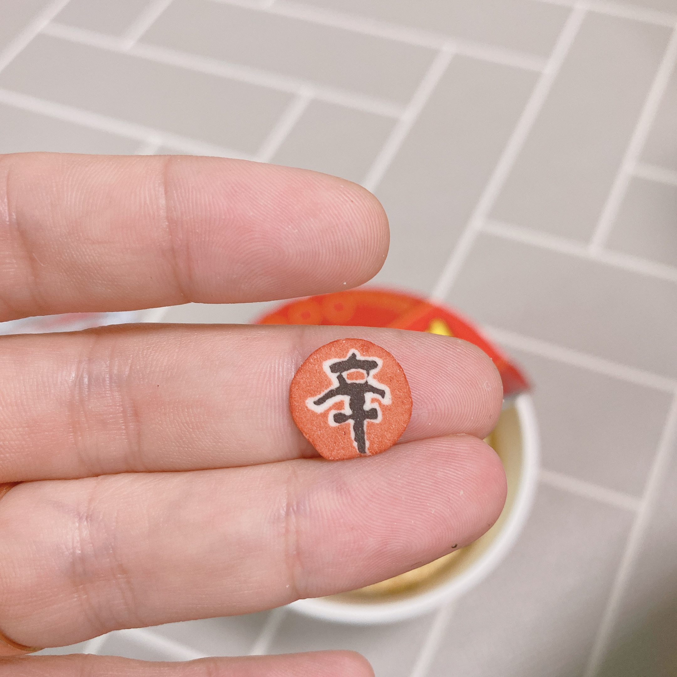 이것은 유니크란 신라면 로고의 어묵이네요. 명품라면답게 로고만 봐도 이것은 신라면이다라고 전 국민이 알 수 있을 정도의 브랜드 라면이죠. 이렇게 신라면 로고에 적혀 있는 까만 글자색은 오징어 먹물로 색을 냈다고 하니 안심하고 드시면 될 것 같습니다. 위에 조리법 사진에서 오징어 먹물로 색을 냈다고 하는 문구가 있었으니 참고하시면 될 것 같습니다.