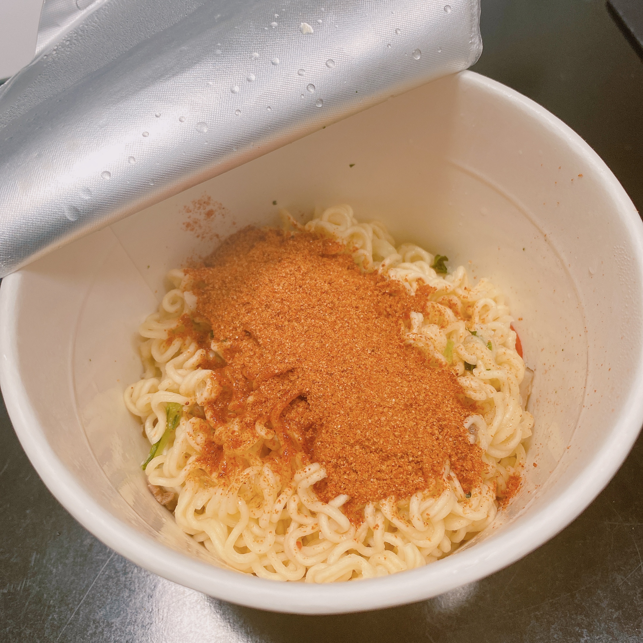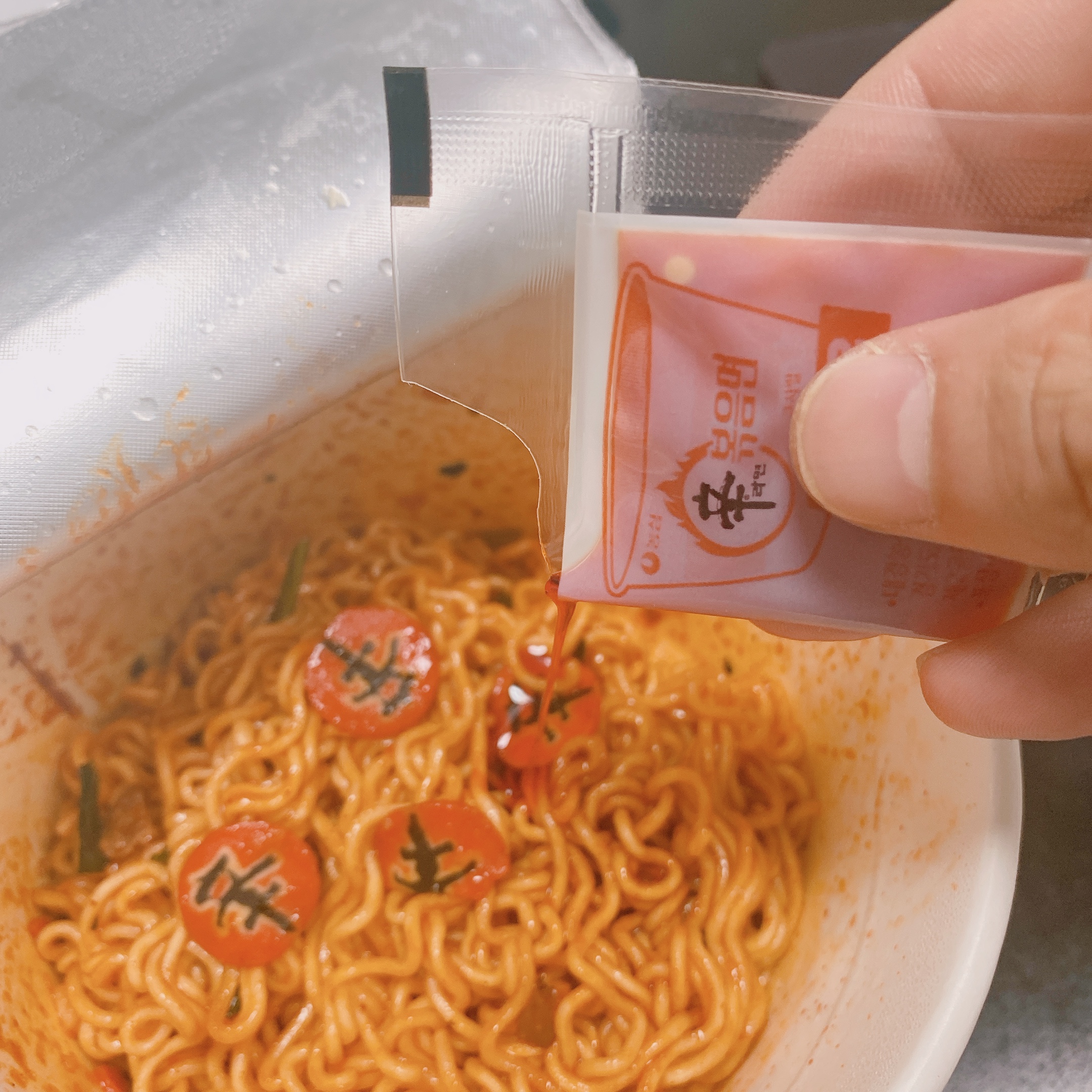 뜨거운 물을 넣은 후 3분 정도 후에 물을 버리시고 분말스프와 조미유를 넣고 잘 비벼 주시면 됩니다. 분말 스프를 넣는 순간 아 그거 신라면인데 라고 생각이 드실 거예요. 신라면 특유의 향이 확~ 나면서 신라면이라는 생각이 확 들더라고요