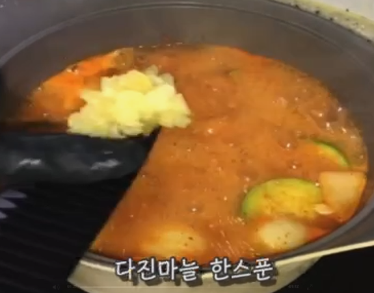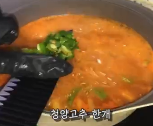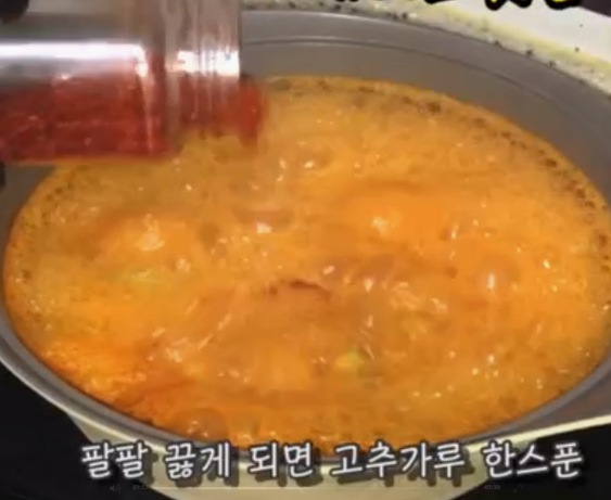 5. 끓기시작하면 고추가루 1스푼, 청양고추, 다진마늘을 넣고 끓여줍니다.