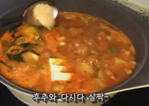 5. 끓기시작하면 고추가루 1스푼, 청양고추, 다진마늘을 넣고 끓여줍니다.