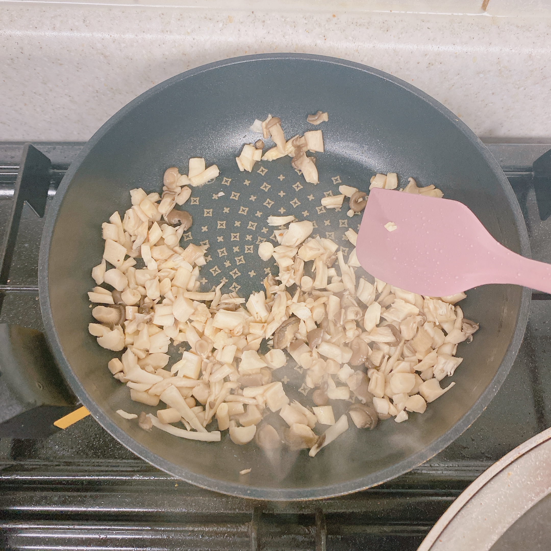 - 여기서는 특별하게 말씀드릴 건 없습니다. 혹시라도 큰 조각들이 있다면 잘라주고 조리도구를 사용하여 버섯을 볶아 줍니다.