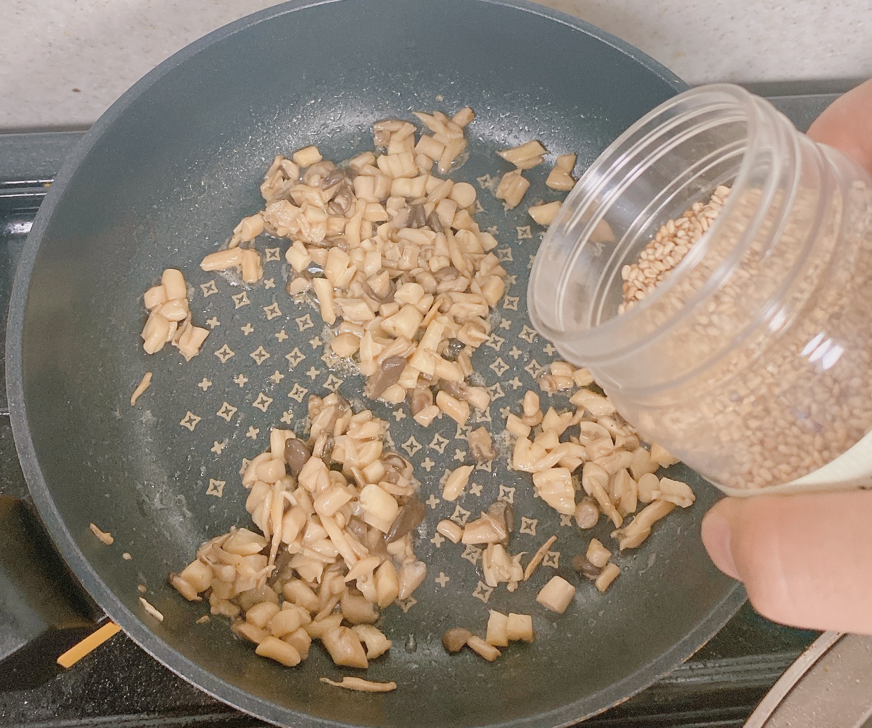 6. 어느 정도 물기가 사라질 정도로 볶아 주셨다면 향을 입힐 참기름을 살짝 넣어주세요.