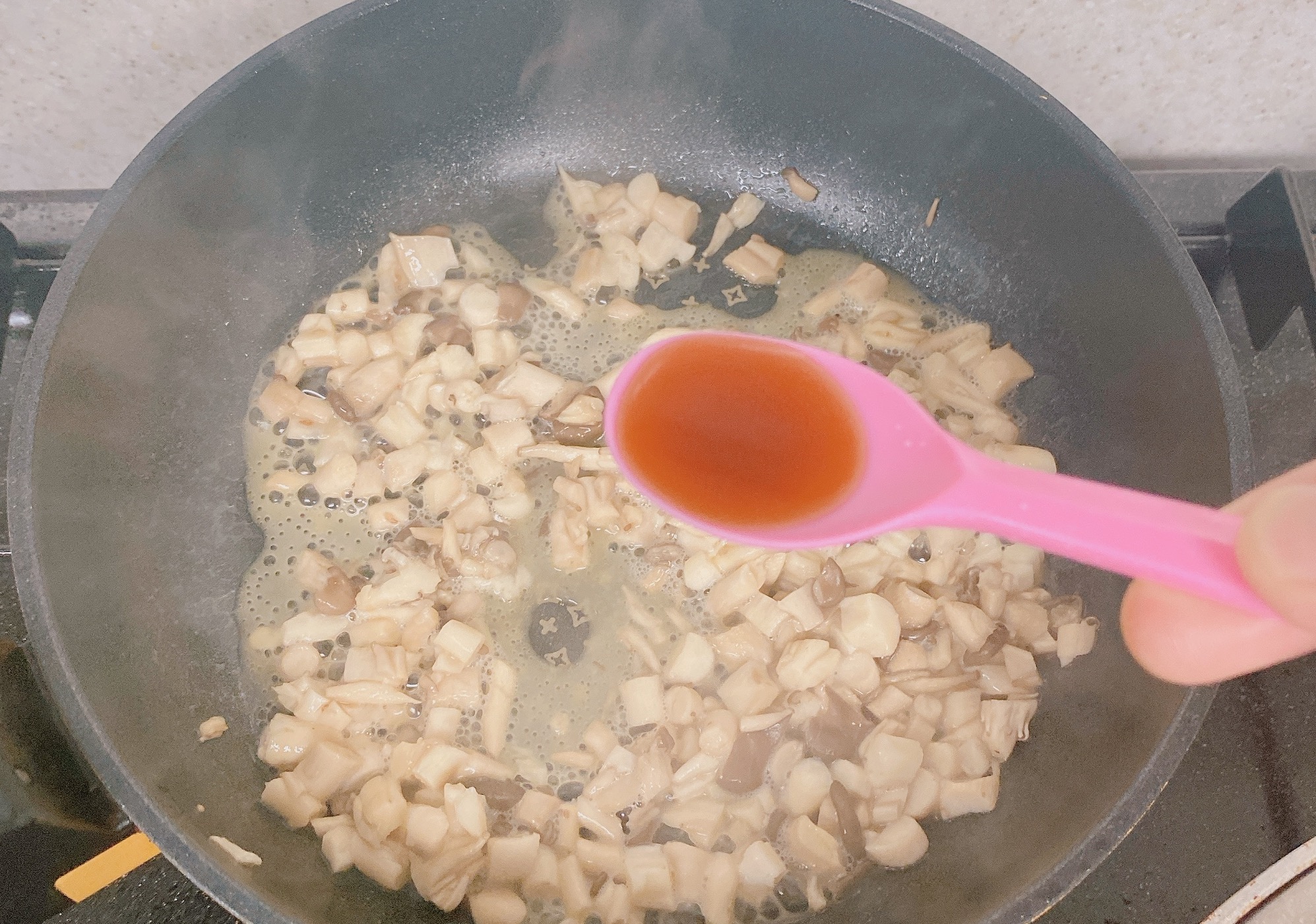 5. 어느 정도 볶아진 버섯에 아기 간장을 1 ~ 1.5 티스푼 넣어줍니다.