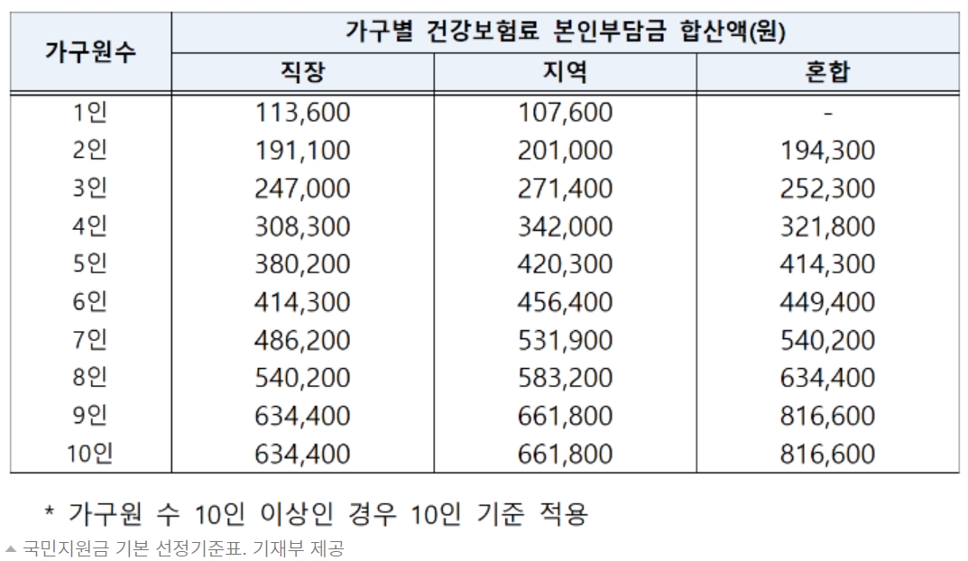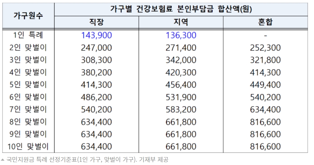 각 가구원수에 6월 건강보험료 본인부담금이 해당 구간 이하로 납부하셨다면 이번 5차 재난지원금 지급대상에 해당되오니 참고하시기 바랍니다. 아래의 표는 1인 가구 및 맞벌이 가구에 대한 특례기준도 함께 공유드리오니 참조하시기 바랍니다.